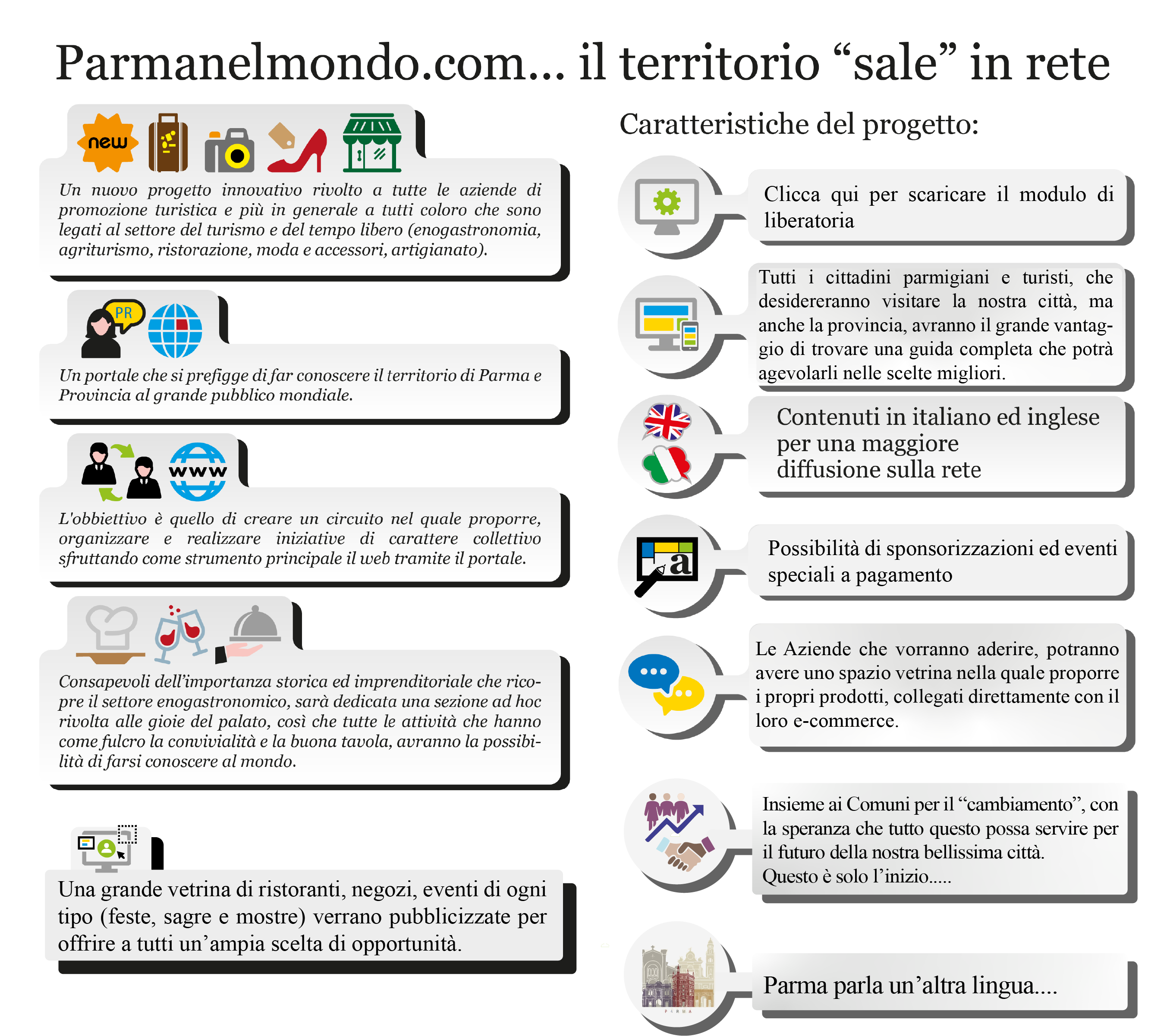 Il portale Parma nel mondo.com sarà a vostra disposizione, per pubblicizzare o divulgare, argomenti da Voi trattati oppure per fare della pubblicità ad azioni da Voi intraprese per il bene della Città di Parma.